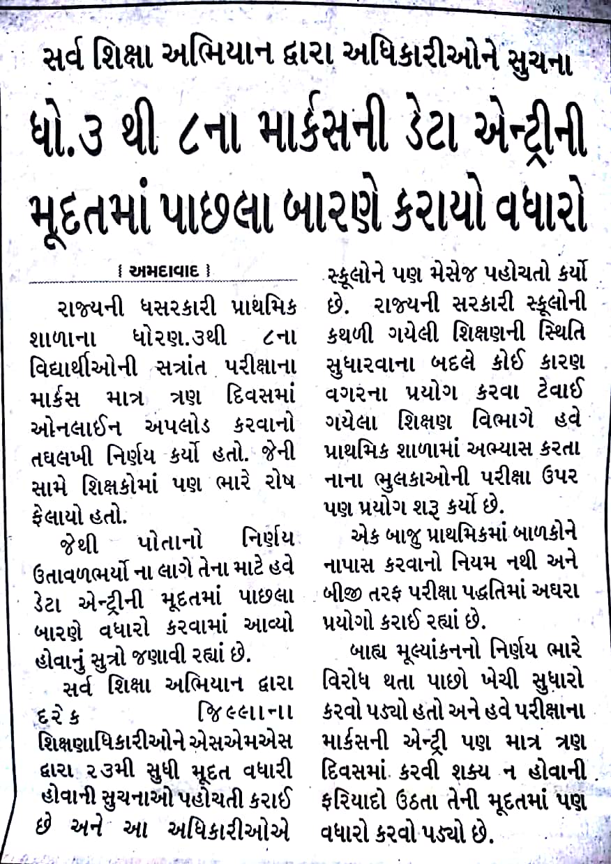 STD 3 TO 8 ONLINE MARK ENTRY MATE MUDAT PACHHALA BARNE VADHI NEWS REPORT.